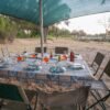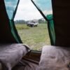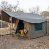 - Camping equipment featuring walk-in mini-meru tents equipped with camp beds, complete bedding, and ensuite bush ablutions